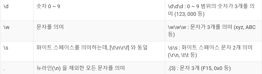 정규 표현식에는 \d말고도 다양한 문법과 기능들이 제공되는 패턴들이 있다.