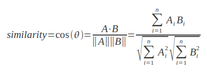 두 벡터 A, B에 대해 코사인 유사도를 구하는 공식이다.