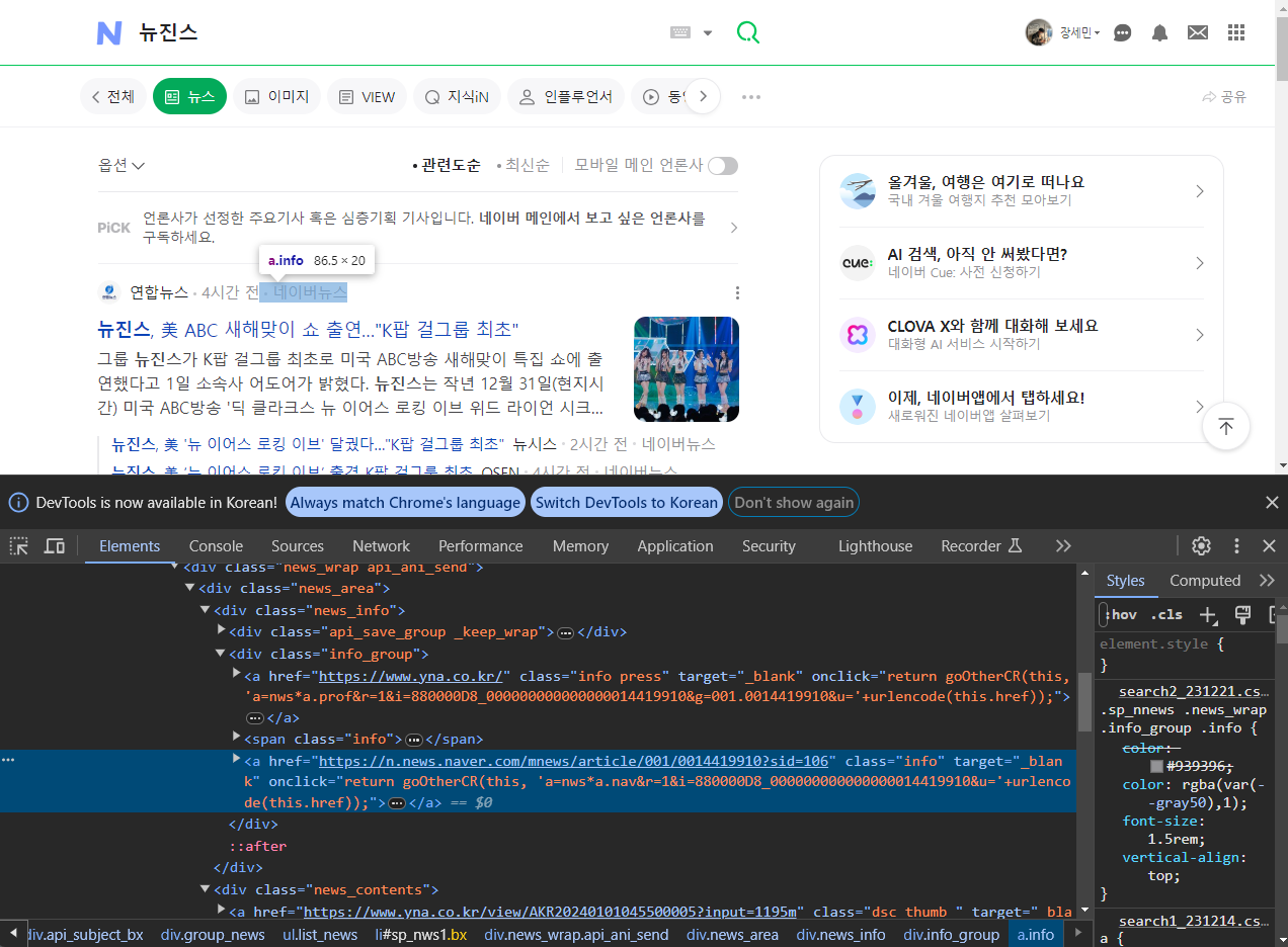 킹짱 '뉴진스' 네이버 뉴스 크롤링을 해볼 예정이다.