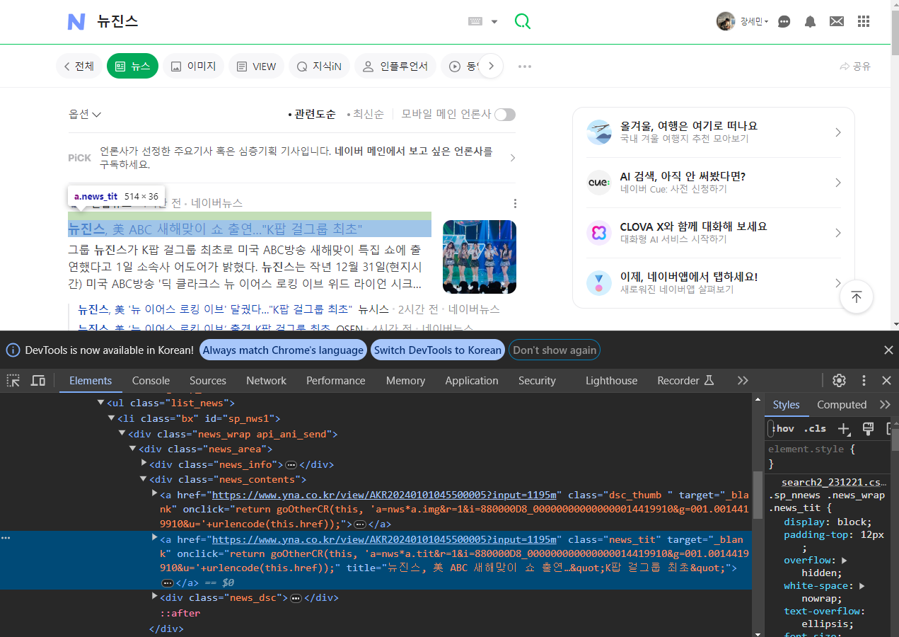 '뉴진스' 검색 후 뉴스 탭에 1번재 페이지에 나타나 있는 뉴스들의 제목을 크롤링 해보자