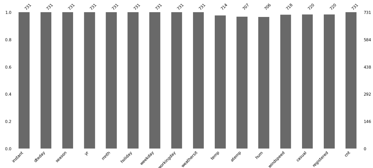 히트맵과 달리 전체 731개의 데이터 중 결측치를 제외한 개수와 막대의 높낮이로 결측치의 비교가 용이해졌다.