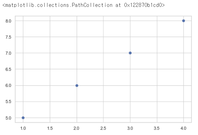 plt.scatter([1,2,3,4],[5,6,7,8]) # 산점도 표현 (1,5), (2,6), ...