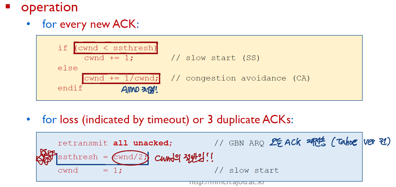 timeout, congestion과 같은 loss 발생 상황 이후 cwnd는 1/2로 감소(MD) 한다.