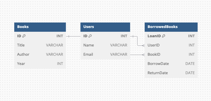 Ref: BorrowedBooks.BookID > Books.ID // 대출 기록과 도서 관계