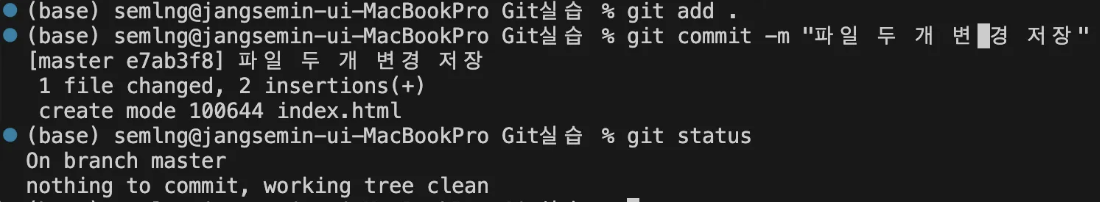 만약, 변경 사항이 많은 경우 git add . 을 사용하면 현재 폴더의 모든 변경 파일을 한 번에 스테이징 영역에 올릴 수 있다.