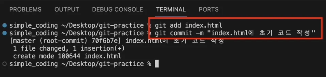 | git commit | 변경한 코드를 저장하는 명령어 (-m “index.html에 초기 코드 작성”)이라는 커밋 메시지 입력 |