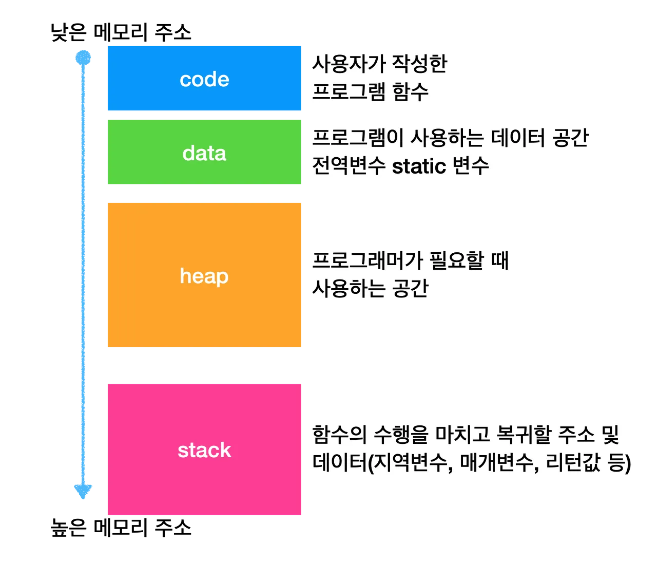 이 공간은 Code, Data, Heap, Stack이라는 네 가지 영역으로 나뉜다.